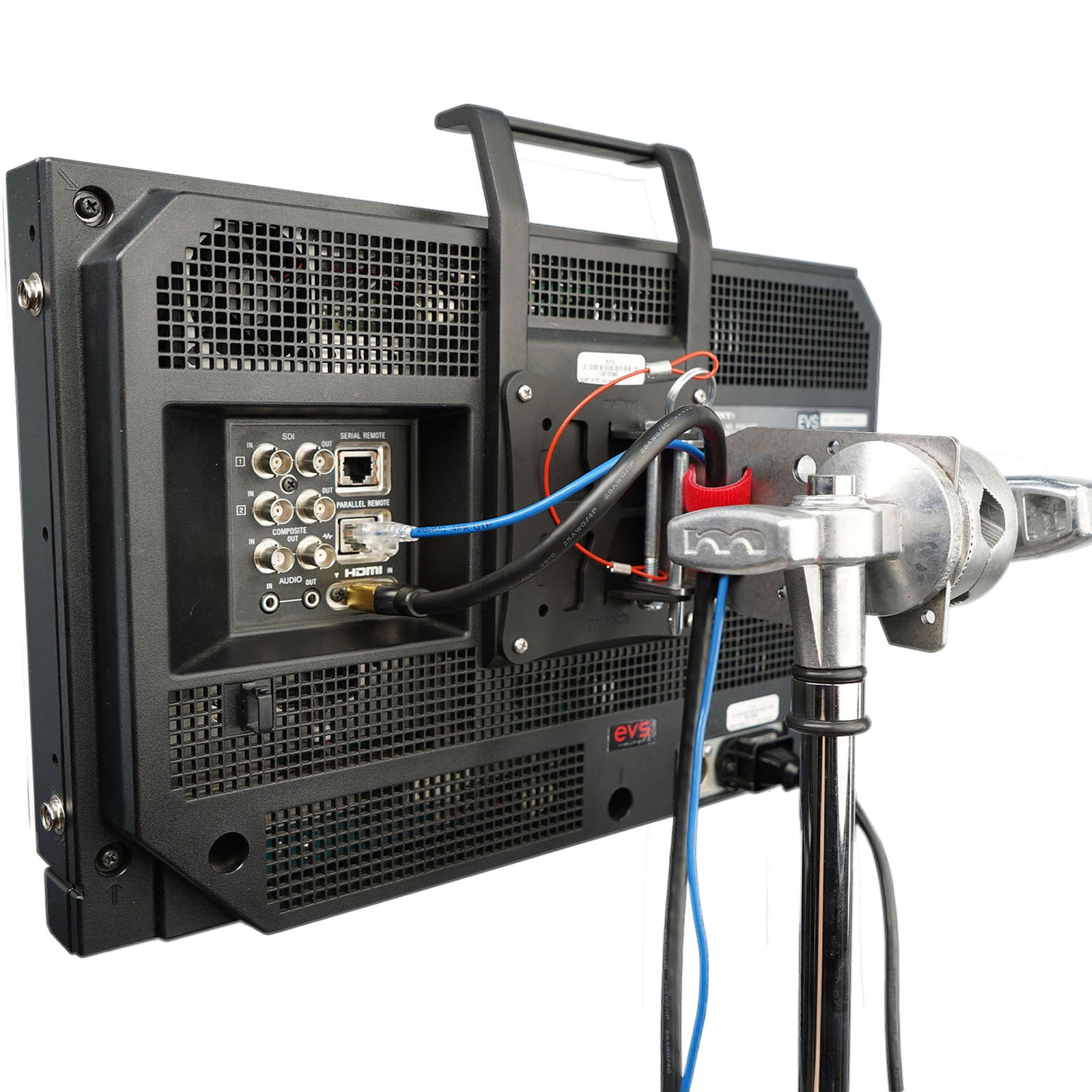 - Two slots at hinge end fit red hook and loop straps for cable management and organization